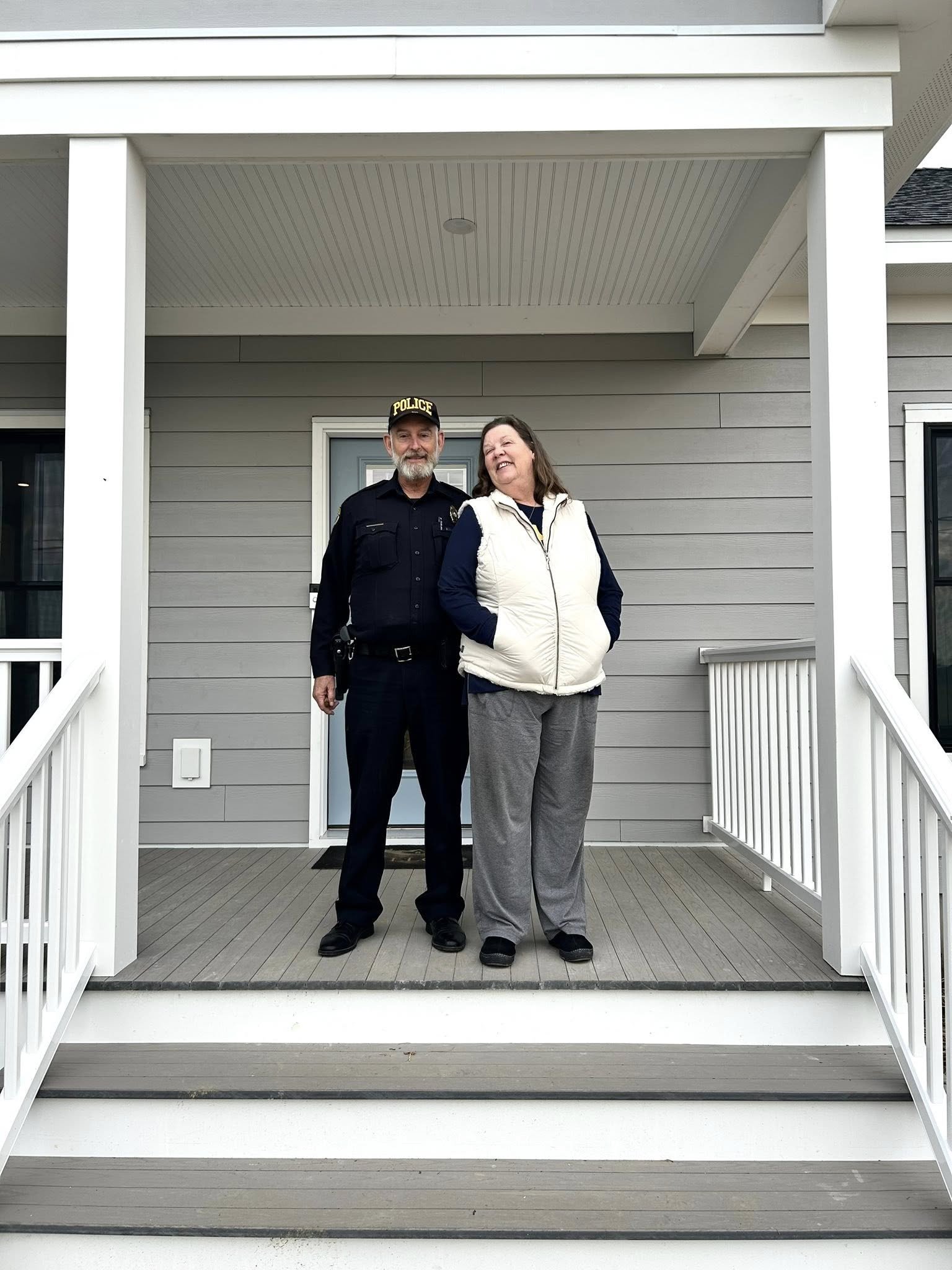 Ed and Betty, happy homeowners on the front porch of their new home.